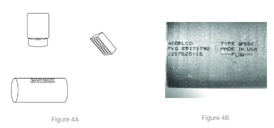 A metal automotive inline fuel filter is being inspected in this example. A dot matrix type print using black ink is parallel to the cylinder’s long axis. Most print reading applications are set up using a standard coaxial lighting geometry. The camera is positioned perpendicular to the print, and the lighting is a typical coaxially mounted directional ring light. This 3D camera–object–light geometry works well if the object is composed of a diffuse, non-reflective material, and is relatively flat. However, in this instance, the surface is not only specular but also curved in one direction. As shown, using the typical coaxial geometry produces an unsatisfactory, non-uniform image.
