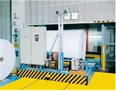 Protection field switching of rail-guided transport trolley for rolls of paper independent of position and direction using laser distance measurement system.