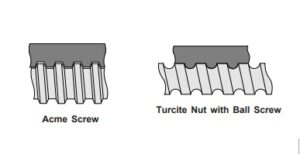 Utilizing a Turcite nut on a ball screw form produces a drive mechanism that has less friction than an acme screw, thus potentially allowing for higher speeds and less input torque required from an attached motor for a given application. It provides smooth motion, low audible noise, and is ideal for vertical applications. Also, using the Turcite nut with high lead ball screws provides for faster linear speeds.