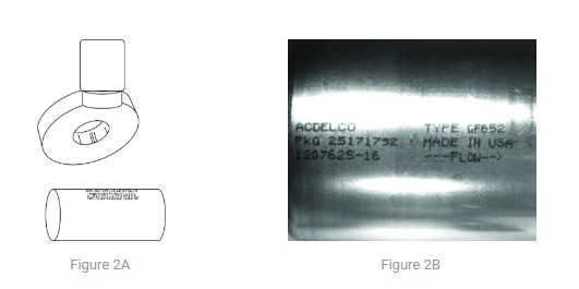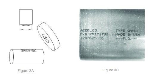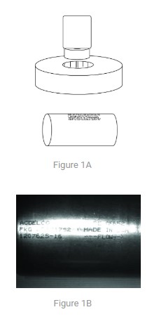 A metal automotive inline fuel filter is being inspected in this example. A dot matrix type print using black ink is parallel to the cylinder’s long axis. Most print reading applications are set up using a standard coaxial lighting geometry. The camera is positioned perpendicular to the print, and the lighting is a typical coaxially mounted directional ring light. This 3D camera–object–light geometry works well if the object is composed of a diffuse, non-reflective material, and is relatively flat. However, in this instance, the surface is not only specular but also curved in one direction. As shown, using the typical coaxial geometry produces an unsatisfactory, non-uniform image.